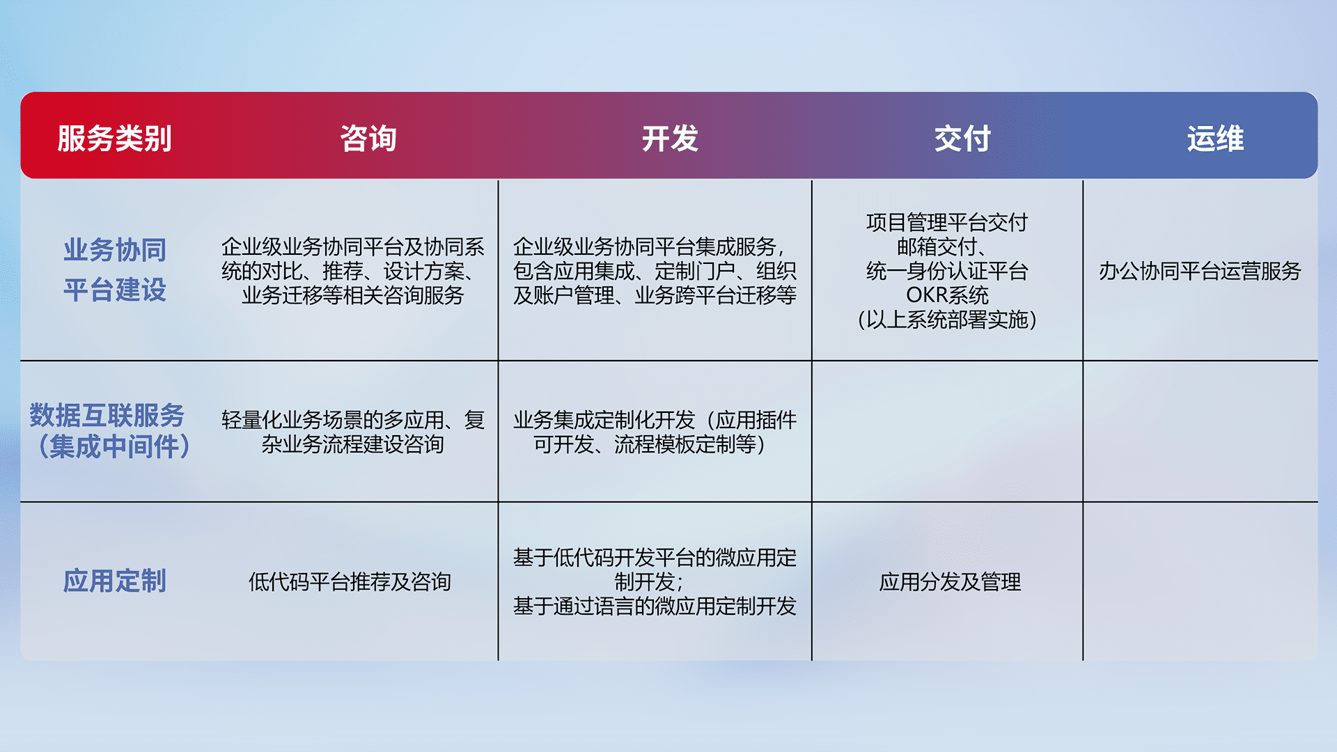 针对钉钉、、企微、、、、IDaas等平台级产品提供产品的规划、、方案、、、交付、、、、定制化开发等服务,,,实现如统一协同办公、、、智能客户服务、、、、混合会议管理、、智能数据查询、、等业务场景,,实现数字化转型。。。